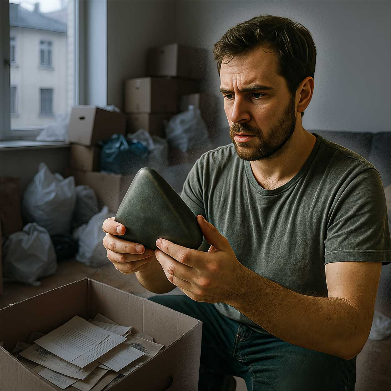 Der Nachmittag draußen wird langsam grau. Es wird bald regnen. Ich höre auf, aufzuräumen, und setze mich aufs Sofa, das Ding immer noch in der Hand. Drehe es, betrachte es aus allen Winkeln. Keine Kratzer, keine Abnutzungsspuren. Keine Beschriftung, kein „Made in China“, kein gar nichts.