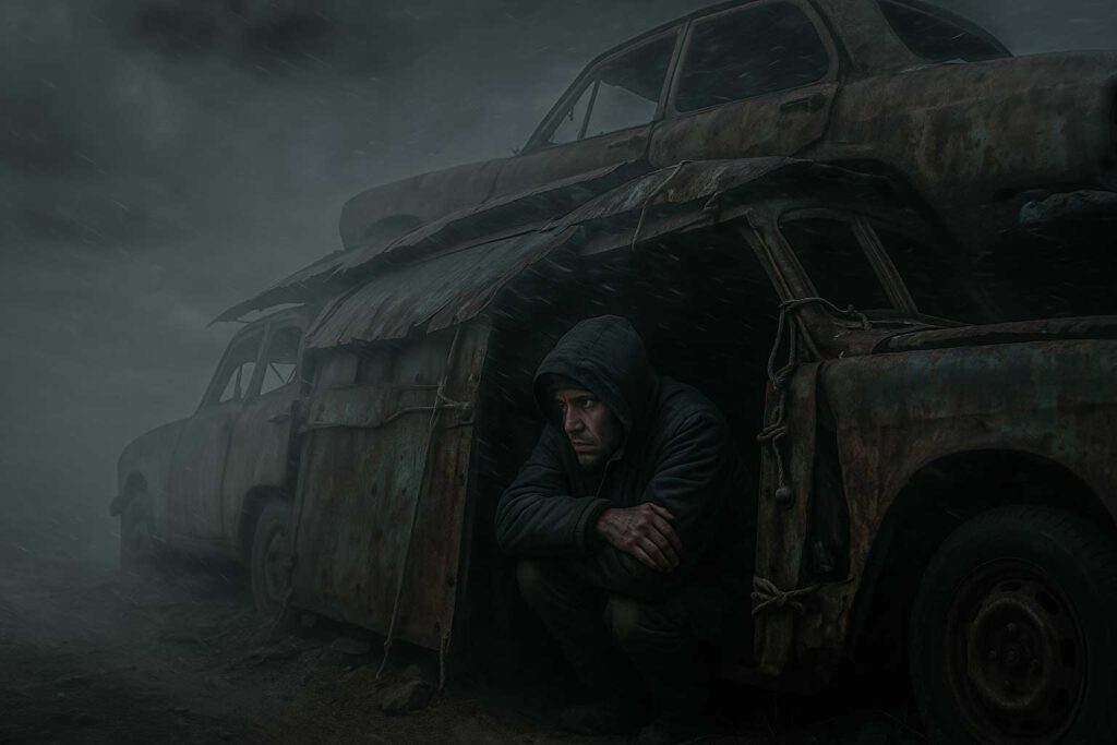 Ich ducke mich tiefer in den Windschatten der verrosteten Autowracks, die wir zu einer Hütte zusammengebaut haben. Der Sturm heult um uns herum wie ein lebendiges Wesen, seine Stimme kalt und gnadenlos. Es ist kein normaler Wind – dieser hier hat Zähne, Klauen, einen Hunger, der nie gestillt wird. Er reißt an den Metallplatten, die wir mit Seilen und Bolzen verzweifelt befestigt haben, als wollte er sie wie Papier zerfetzen. Manchmal frage ich mich, ob er uns wirklich nur auslöschen will oder ob er etwas anderes sucht. Etwas, das wir ihm vorenthalten.