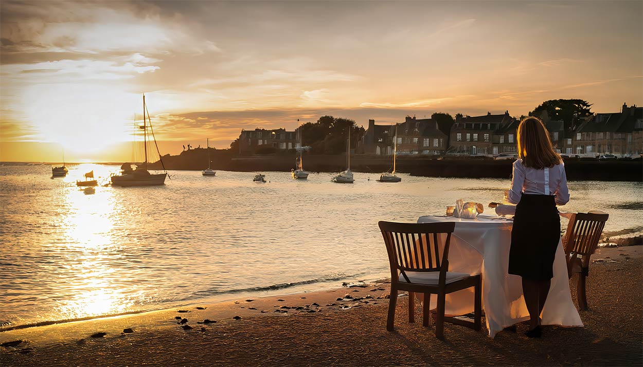 Ich sitze hier. Der Stuhl ist hart, das Tischtuch blendend weiß. Ein absurder Kontrast zu dem, was drumherum passiert. Die Sonne, dieser orangefarbene Klotz, versinkt gerade im Meer, zieht das ganze Wasser mit sich in diesen irren, goldenen Sog. Es ist lautlos, aber ich spüre das Ziehen in der Brust.